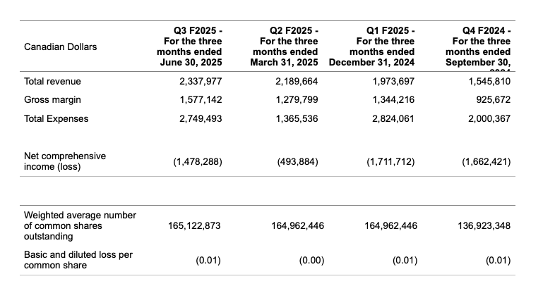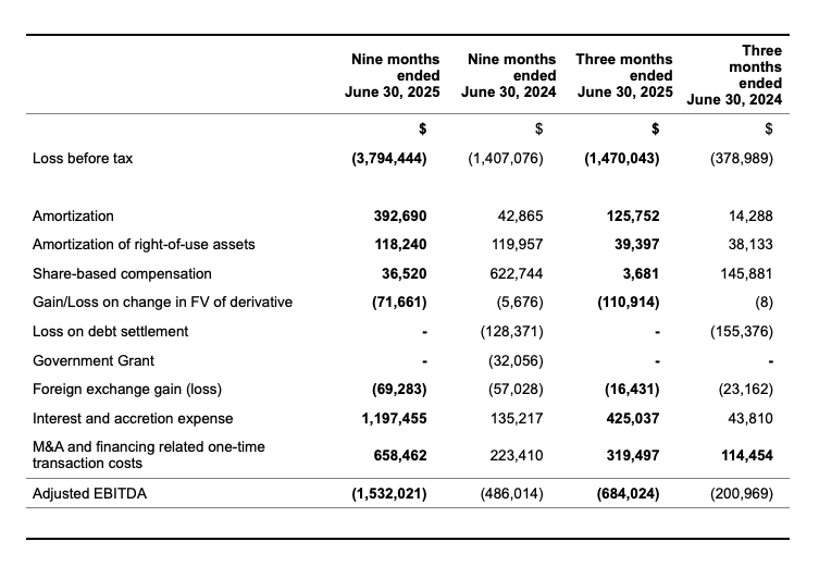 Adjusted EBITDA is a non-IFRS financial measure that we calculate as net income (loss) before tax excluding depreciation and amortization expense, share based expense, gain/loss on change on fair value of derivatives, loss on debt settlement, government grants, foreign exchange gain/loss, interest and accretion and SRED refund. Adjusted EBITDA is used by management to understand and evaluate the performance and trends of the Company’s operations. The following table shows a reconciliation of adjusted EBITDA to net income (loss) before tax, the most comparable IFRS financial measure, for the three and nine months ended June 30, 2025 and 2024: